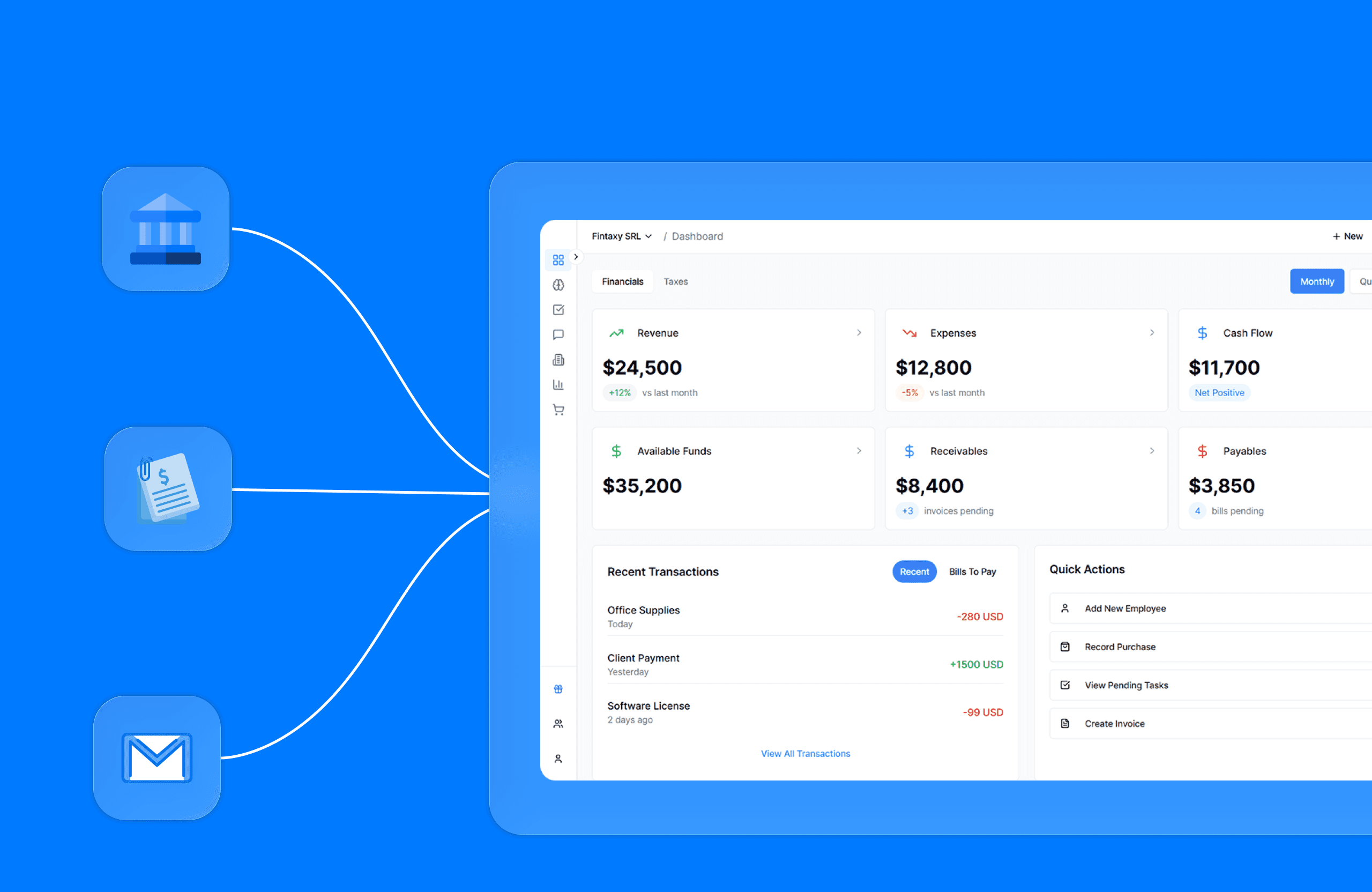 Fără tab-uri, fără haos. Fintaxy adună facturarea, contabilitatea, banking-ul, e-Factura, încasările, plățile, rambursările, email, documentele, excel și rapoartele într-o singură platformă AI.